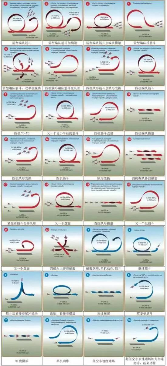 编队飞行表演由于飞机数量较多,机型也可以不限于同型机,各种队形变换带来了复杂的表演动作和更强的艺术表现力。下面是俄国网站给出的一套雨燕队的Mig-29飞行表演的动作分解,可以很清楚的了解到,一套飞行表演动作是如何由一个个单独的动作所串起来的。