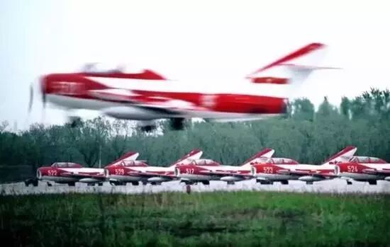 这是红白涂装的歼教五,八一队就是用它飞出了九机大编队。可惜之后再未见这种壮观的大编队。之前还有歼五、歼六的时代,可惜那时候的彩色照片难以寻觅了。